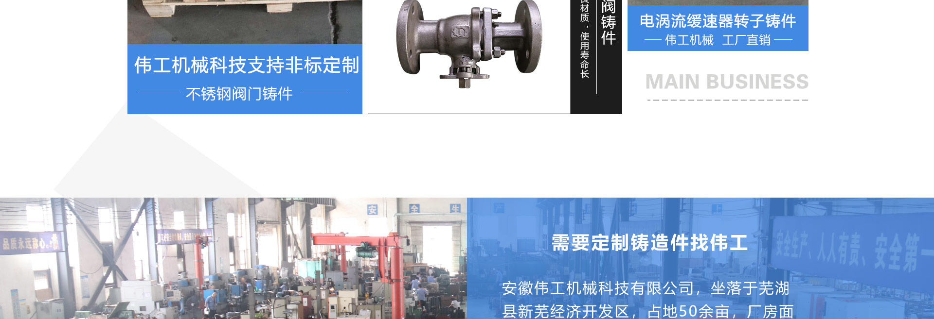 安徽偉工機(jī)械科技有限公司,坐落于安徽蕪湖新蕪經(jīng)濟(jì)開發(fā)區(qū),是一家専業(yè)從事鑄造產(chǎn)品設(shè)計(jì)、研發(fā)、生產(chǎn)、銷售于一體的企業(yè),公司為客戶的產(chǎn)品提供多樣的技術(shù)支持與設(shè)計(jì),公司主要鑄造技術(shù)有潮模砂鑄造、硅溶膠精鑄工藝。主要產(chǎn)品有:不銹鋼閥門配件、泵閥配件、汽車配件、工業(yè)管道配件、工程機(jī)械配件、汽車配件等。材質(zhì)為:低合金鋼、304、316、316L、鉻鉬鋼、哈氏合金、碳鋼、雙相鋼等。公司已先后通過ISO9001和TS16949等多種體系審核,以完備的管理手段和齊全的檢測(cè)設(shè)備滿足客戶需求,進(jìn)的設(shè)備,専業(yè)的技術(shù),嚴(yán)謹(jǐn)?shù)墓芾恚€(wěn)定的質(zhì)量。服務(wù)客戶,鑄造未來,偉工誠摯的歡迎新老客戶共同商洽合作